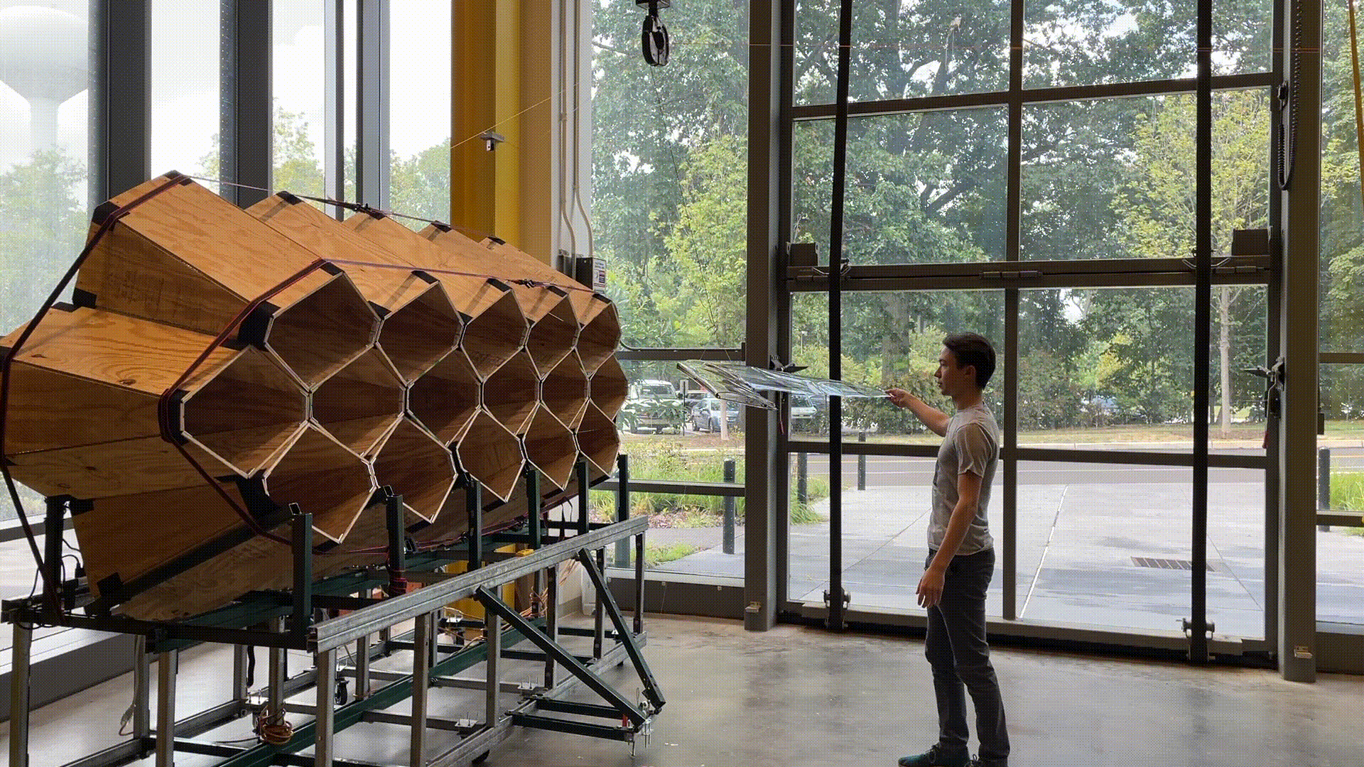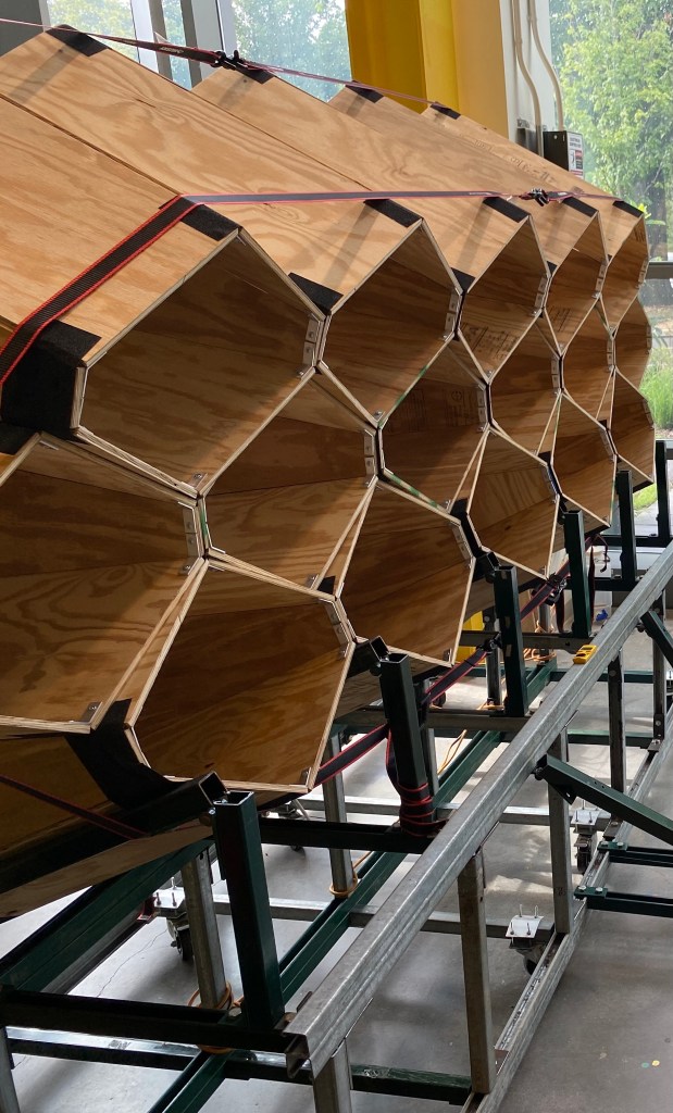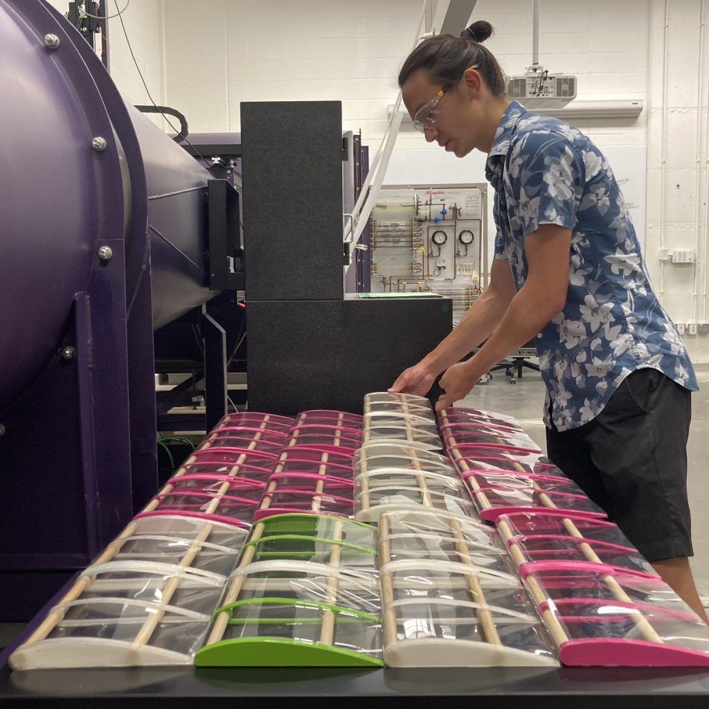 Currently my most active area of research, I am investigating how the aerodynamic stability of AWE kites can be influenced by both passive wing geometry and active control surfaces. Since airfoil inversion can be controlled independently at a wing’s root and wingtip, this mechanism can provide roll and adverse yaw control to swept wing kites as well as letting them power dive between energy cycles. These stability considerations directly dictate kite structure: three spars running along the kite’s interior wingspan will double as structural beams and driveshafts to turn the inverting airfoils at different wing sections. In the summer of 2022, I designed and led the construction of a large area wind testing platform for large scale (~3m wingspan) inverting kite tests. This fall and spring, I plan to use that testing platform to validate wing structure designs and experiment with inverting control surfaces and algorithms for active roll and adverse yaw stability. View more.