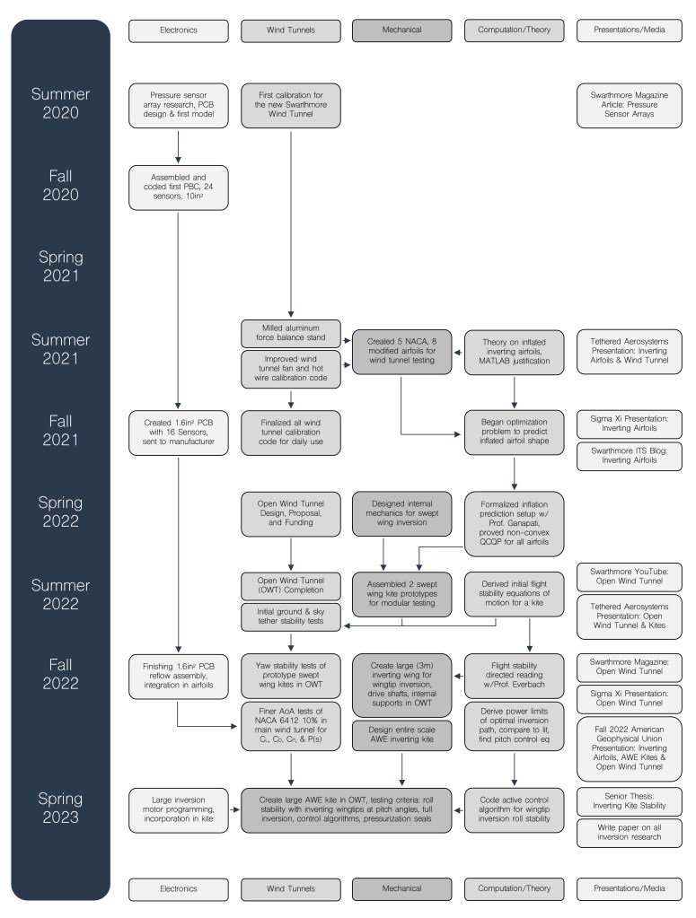 Energy efficiency for the economic viability of AWE is paramount to its success. My goal, as the lead student engineer of the Swarthmore AWE research group with Prof. Carr Everbach, is to create a flight mechanism that allows AWE kites to rapidly yet predictably descend on command. Such a kite would need to morph its shape, thereby changing its aerodynamic characteristics, to allow the wind to propel it toward the ground— the generator would then only reel in the falling tether. Inflated wings with fabric surfaces would simultaneously make the kite lighter to produce greater lift while providing rigidity similar to pressurized beams. Finally, wingtip control surfaces would be necessary to control roll stability and subsequent adverse yaw; a bridled control pod on the main tether would provide pitch control. The mechanisms that I devised to address all these concerns are: inverting airfoils.