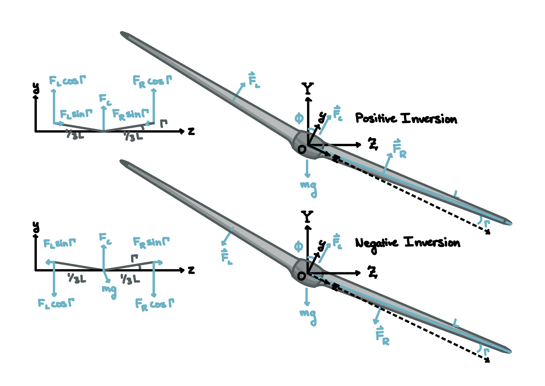 An inverting airfoil can rotate its circular leading edge to pull in a fabric surface on one airfoil side while simultaneously paying out fabric to the other. With a pressurized interior and internal fabric supports maintaining the airfoil’s outer shape, inversion effectively flips the airfoil’s camber along its chord line. In turn, these airfoils can completely reverse their direction of lift without requiring mechanically complex or heavy control surfaces typical of most aircraft wings.