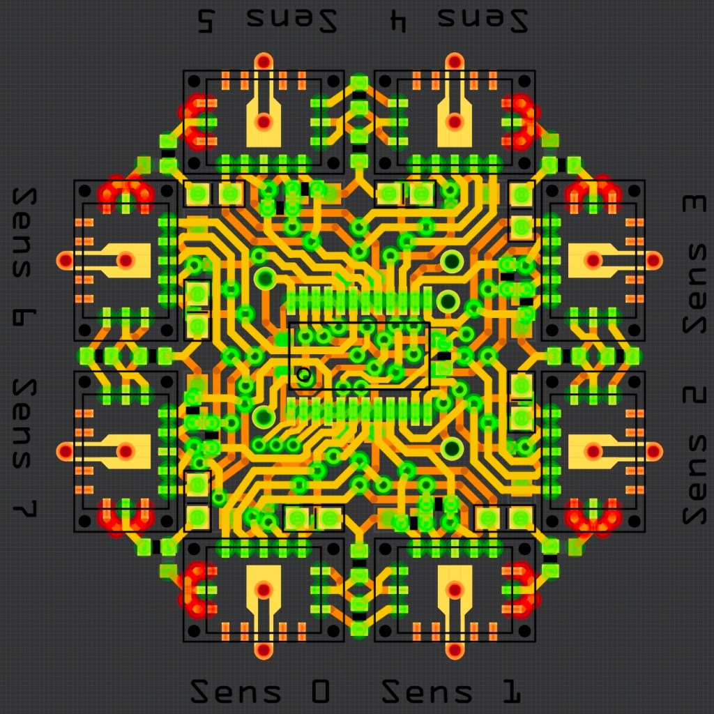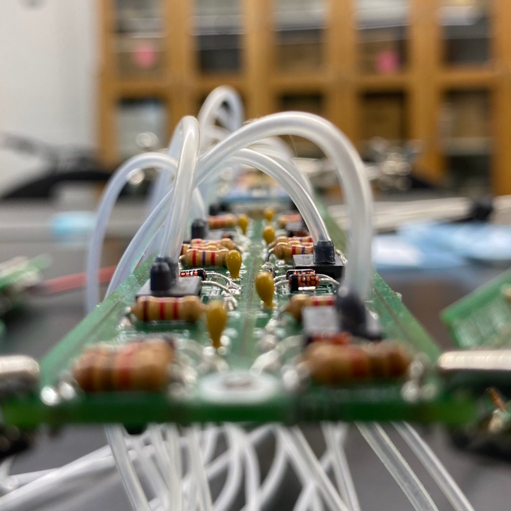 As the first student technician to service the new Swarthmore Wind Tunnel, I have contributed many MATLAB routines to the tunnel’s sensor calibration and spatial scanning programs. On top of fixing equipment and machining new strain gauge mounts, I also serve as a lab supervisor when Drexel University researchers use the tunnel for their own experiments. Since my freshman summer, I have also been developing a miniature differential pressure sensor array to compliment the tunnel’s force balance. Localized pressure distributions around the surface of a wing are a key factor in determining the wing’s aerodynamic characteristics, so fitting such a sensor array inside a wing would benefit future wind tunnel research. My first working array fit 6 sensors on a 5in2 printed circuit board (PCB); my second major redesign packed 24 sensors onto an 10in2 PCB; my current iteration squeezes 16 sensors into a 1.6in2 area. This latest PCB also houses dozens of other surface mount devices, multiplexers, and indicator LEDs. View more.